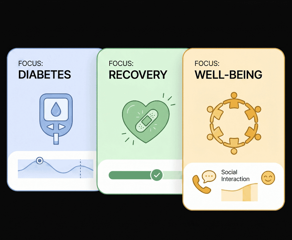 Track what matters to you—diabetes management, post-surgery recovery, or daily loneliness. Your concerns, your focus.